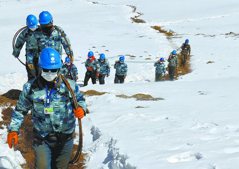 圖為國網(wǎng)玉樹供電公司工作人員對110千伏玉治一回輸電線路開展雪后特巡、設備消缺工作。 徐曉韜 攝