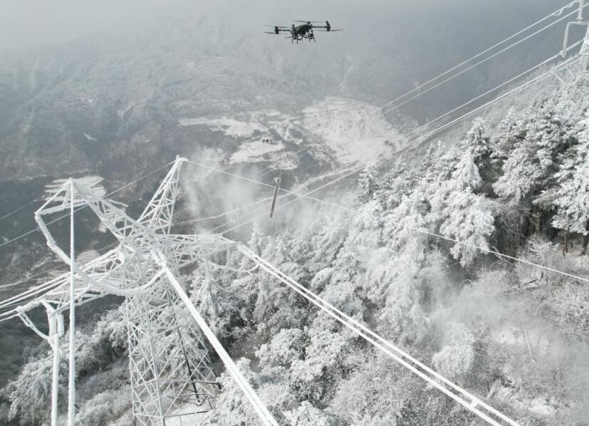 在海拔2800米的雅安市漢源縣蓑衣嶺,氣溫降至零下7℃,連接雅安至樂山的220千伏漢音輸電線路覆冰厚度已達(dá)10毫米。國網(wǎng)雅安供電公司組織電力運維人員持續(xù)開展冰情監(jiān)測,運用無人機搭載除冰裝置撞擊覆冰導(dǎo)線完成帶電除冰,及時消除輸電線路安全隱患。
