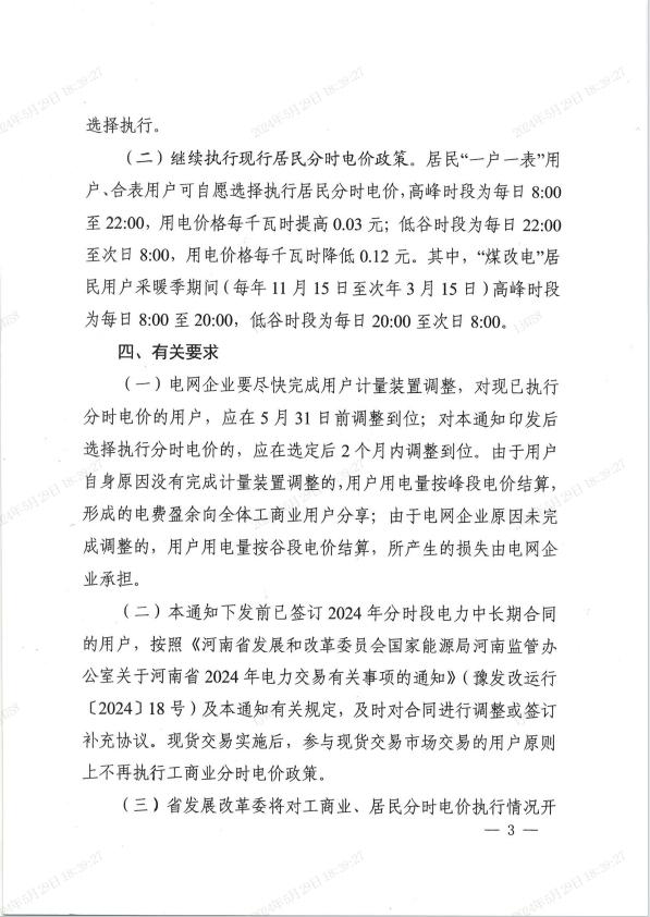 (二)本通知下發(fā)前已簽訂2024年分時(shí)段電力中長(zhǎng)期合同的用戶,按照《河南省發(fā)展和改革委員會(huì)國(guó)家能源局河南監(jiān)管辦公室關(guān)于河南省2024年電力交易有關(guān)事項(xiàng)的通知》(豫發(fā)改運(yùn)行〔2024〕18號(hào))及本通知有關(guān)規(guī)定,及時(shí)對(duì)合同進(jìn)行調(diào)整或簽訂補(bǔ)充協(xié)議?,F(xiàn)貨交易實(shí)施后,參與現(xiàn)貨交易市場(chǎng)交易的用戶原則上不再執(zhí)行工商業(yè)分時(shí)電價(jià)政策。