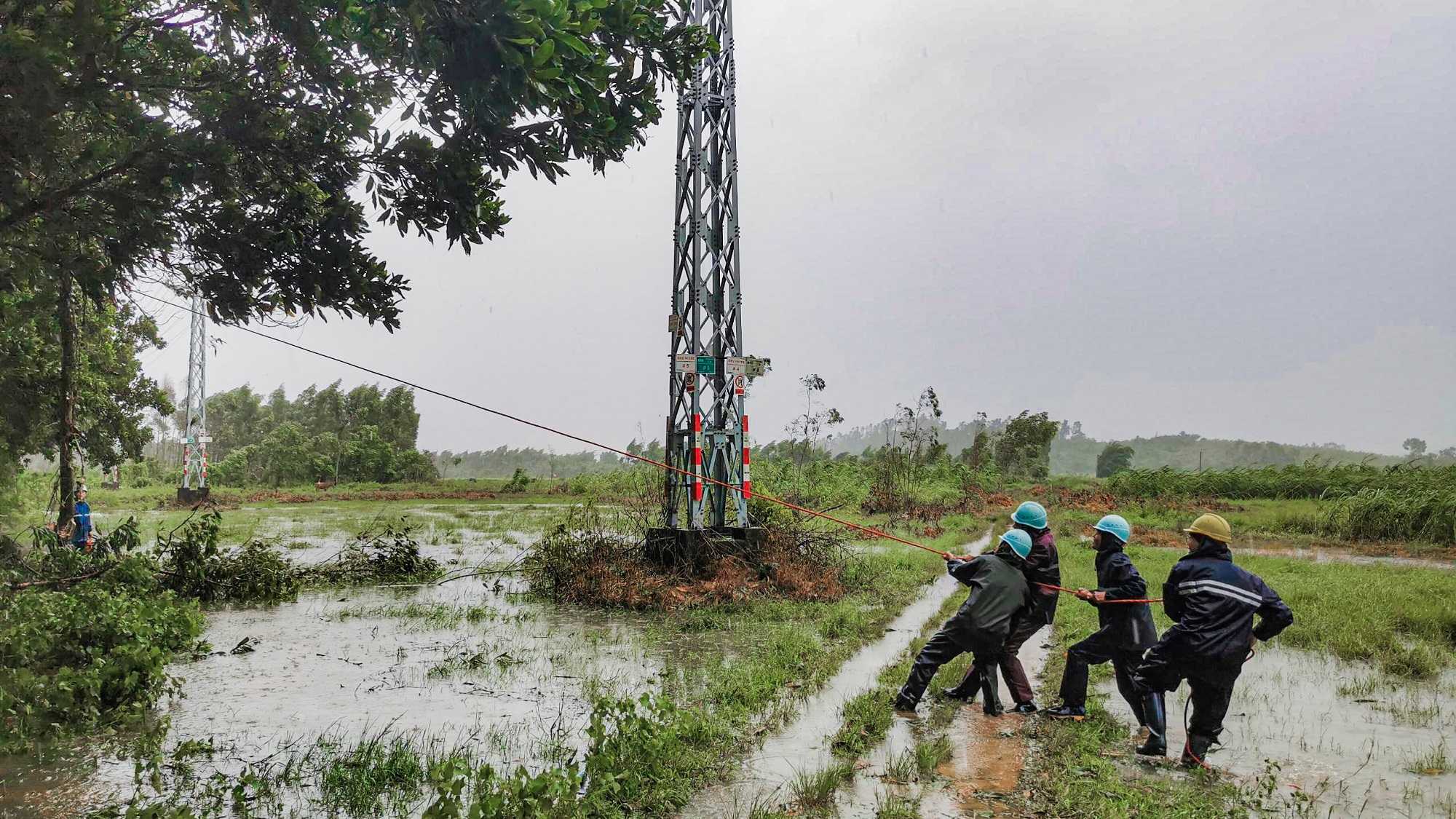南方電網(wǎng)廣東陽(yáng)江陽(yáng)東供電局新洲供電所運(yùn)維人員緊急清理線路旁樹(shù)障,避免倒伏造成跳閘。廖澤霖 攝