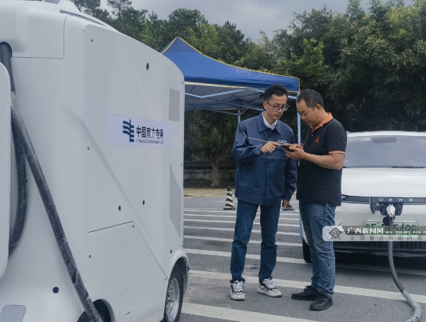 在G80廣昆高速容縣服務(wù)區(qū),南方電網(wǎng)廣西電網(wǎng)公司工作人員指引幫助返鄉(xiāng)群眾使用移動(dòng)充電車充電。通訊員 董申頌 攝