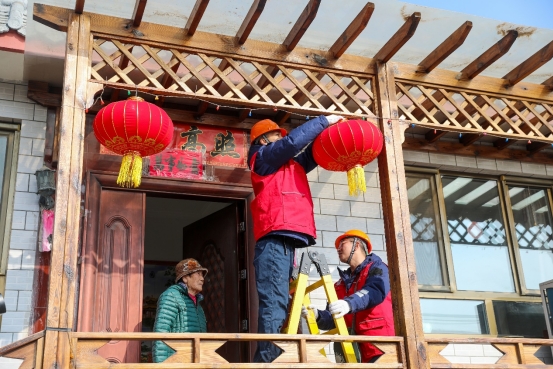 2月6日,國網(wǎng)北京門頭溝供電公司妙峰山供電所員工在炭廠村開展春節(jié)保電走訪,到獨居老人家檢查“煤改清潔能源”用電設備,幫助掛紅燈籠。(張文靜 攝)