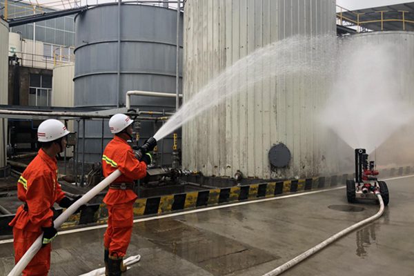 本次演習(xí)模擬火災(zāi)險(xiǎn)情為龍雁工業(yè)園區(qū)一企業(yè)在日常生產(chǎn)過(guò)程發(fā)現(xiàn)罐區(qū)內(nèi)的1號(hào)罐體下方有濃煙冒出并帶著明火,且有工作人員由于吸入濃煙暈倒在現(xiàn)場(chǎng)的情況。演練中,龍雁工業(yè)園區(qū)管委會(huì)接到火情后,立即通知該公司專職消防隊(duì)到現(xiàn)場(chǎng)協(xié)同園區(qū)滅火機(jī)器人開展聯(lián)合滅火,消防隊(duì)員與滅火機(jī)器人對(duì)火情危險(xiǎn)的位置進(jìn)行撲救,并對(duì)現(xiàn)場(chǎng)暈迷的人員進(jìn)行救援。經(jīng)過(guò)雙方共同配合現(xiàn)場(chǎng)火情得到有效控制,暈迷的人員得到及時(shí)救助,應(yīng)急演練達(dá)到預(yù)期效果。