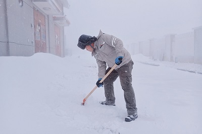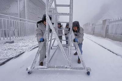 在冰凍中連續(xù)作業(yè)二、三個小時,冰雪落在他們的帽子上、衣服上、鞋上,凝結(jié)成僵硬的冰塊;吹在頭發(fā)上、胡渣上,化作冰花將他們變成“守護(hù)平安”的圣誕老人模樣。