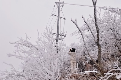 9m/s的疾風(fēng)夾著凍雨、飄雪,像刀子一般刮得臉頰生疼,雪地里呆上十分鐘,便手腳凍得通紅腫脹活動受限。在做好充分準(zhǔn)備的條件下,A、B、C三相融冰短接線接線最快也得一個小時,非常挑戰(zhàn)人員的抗凍極限。大家都聚集在雪地中各司其中,搬熱水、扶梯子、驗電、掛接地線、接融冰短接線......鮮艷的黨旗迎風(fēng)飄揚(yáng),仿佛在為他們吶喊加油鼓勁。
