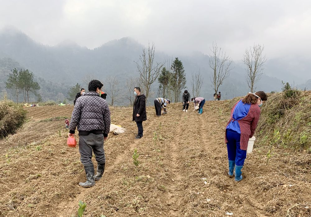 然而在村里的油茶種植基地里卻是另外一番場景,幾輛拖拉機(jī)來往運(yùn)送土豆種子,二十幾個(gè)村民戴著口罩在地里忙碌著,整地、挖坑、選種、澆水、施肥,一幅生機(jī)勃勃的景象。