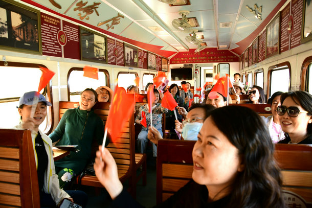 車廂內(nèi)女職工們一邊欣賞沿途美景,一邊自由暢談?!饵h史知識》、《女職工勞動保護(hù)特別規(guī)定》環(huán)節(jié)大家爭先恐后舉手,氣氛熱烈有趣,在搶答過程中既學(xué)習(xí)到黨史知識又增添了學(xué)習(xí)的趣味。全體人員集體合唱《我和我的祖國》,在歌聲中現(xiàn)場氣氛達(dá)到了高潮。下車后,大家來到黨建主題廣場參觀學(xué)習(xí)。