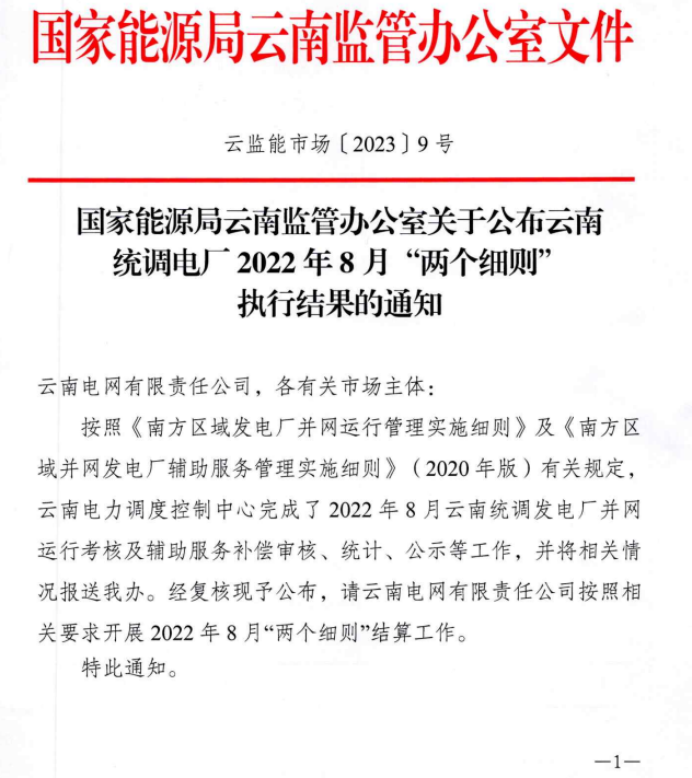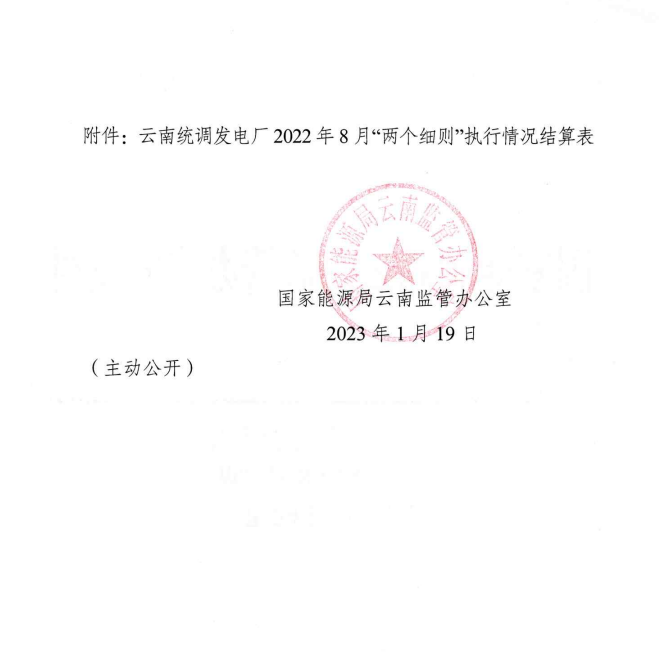 1月19日,國家能源局云南監(jiān)管辦公室公布云南統(tǒng)調(diào)電廠2022年8月“兩個(gè)細(xì)則”執(zhí)行結(jié)果。