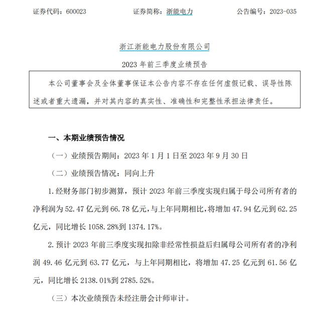 浙能電力稱,經財務部門初步測算,預計2023年前三季度實現(xiàn)歸屬于母公司所有者的凈利潤為52.47億元到66.78億元,與上年同期相比,將增加47.94億元到62.25億元,同比增長1058.28%到1374.17%。預計2023年前三季度實現(xiàn)扣除非經常性損益后歸屬母公司所有者的凈利潤49.46億元到63.77億元,與上年同期相比,將增加47.25億元到61.56億元,同比增長2138.01%到2785.52%。