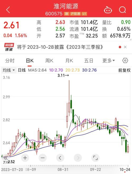 10月24日,淮河能源報收2.61元/股,漲幅1.56%,總市值為101億元。