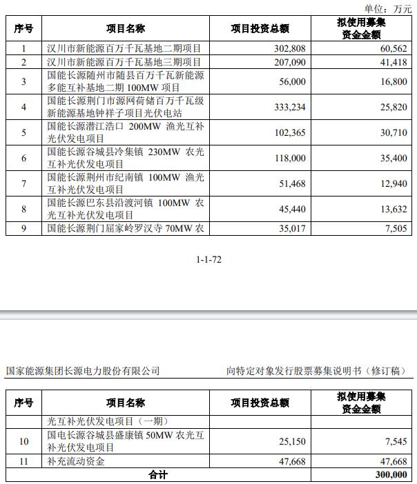 長源電力向特定對象發(fā)行股票募集說明書(修訂稿)(2023年三季度財務(wù)數(shù)據(jù)更新版)顯示,本次發(fā)行股票募集資金總額不超過300,000萬元(含本數(shù)),扣除發(fā)行費用后的募集資金凈額將用于漢川市新能源百萬千瓦基地二期項目、漢川市新能源百萬千瓦基地三期項目、國能長源隨州市隨縣百萬千瓦新能源多能互補(bǔ)基地二期100MW項目、國能長源荊門市源網(wǎng)荷儲百萬千瓦級新能源基地鐘祥子項目光伏電站、國能長源潛江浩口200MW漁光互補(bǔ)光伏發(fā)電項目、國能長源谷城縣冷集鎮(zhèn)230MW農(nóng)光互補(bǔ)光伏發(fā)電項目、國能長源荊州市紀(jì)南鎮(zhèn)100MW漁光互補(bǔ)光伏發(fā)電項目、國能長源巴東縣沿渡河鎮(zhèn)100MW農(nóng)光互補(bǔ)光伏發(fā)電項目、國能長源荊門屈家?guī)X羅漢寺70MW農(nóng)光互補(bǔ)光伏發(fā)電項目(一期)、國電長源谷城縣盛康鎮(zhèn)50MW農(nóng)光互補(bǔ)光伏發(fā)電項目、補(bǔ)充流動資金。