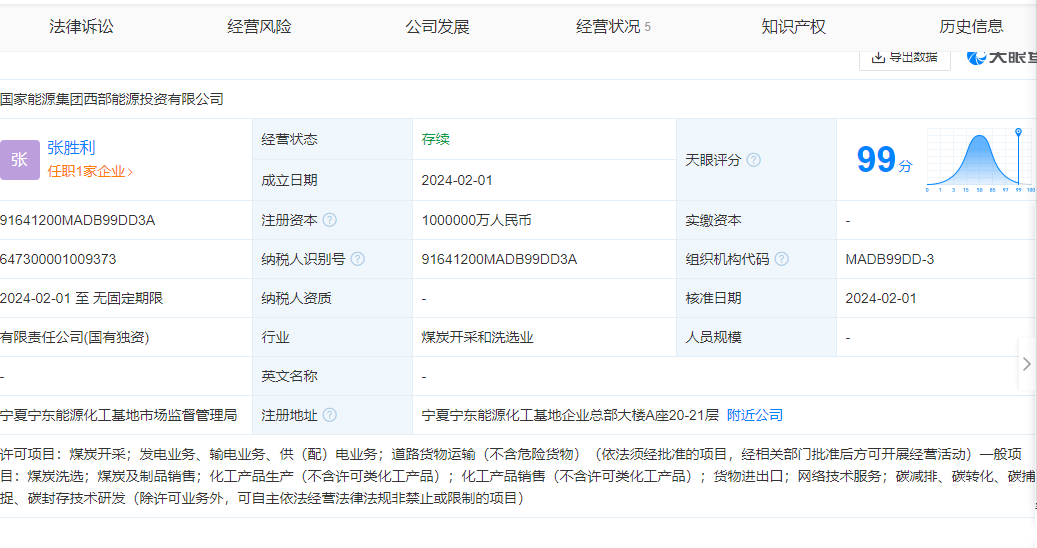 近日,國(guó)家能源集團(tuán)西部能源投資有限公司注冊(cè)成立,位于寧夏回族自治區(qū)銀川市,法定代表人為張勝利,注冊(cè)資本100億人民幣。