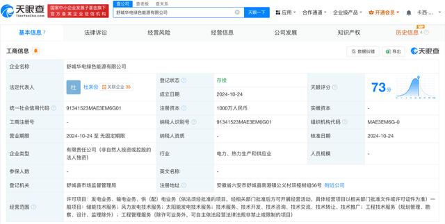 近日,舒城華電綠色能源有限公司成立,法定代表人為杜來(lái)會(huì),注冊(cè)資本1000萬(wàn)元人民幣,經(jīng)營(yíng)范圍含發(fā)電業(yè)務(wù)、輸電業(yè)務(wù)、供(配)電業(yè)務(wù),儲(chǔ)能技術(shù)服務(wù),風(fēng)力發(fā)電技術(shù)服務(wù),太陽(yáng)能發(fā)電技術(shù)服務(wù)等。股東信息顯示,該公司由華電集團(tuán)旗下華電安徽新能源有限公司全資持股。