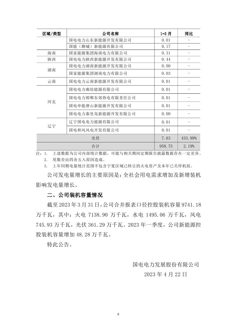 國電電力日前發(fā)布2023年一季度電量情況。2023年一季度公司合并報(bào)表口徑完成發(fā)電量1012.01億千瓦時(shí),上網(wǎng)電量958.75億千瓦時(shí),較上年同期分別下降5.39%和5.50%;按照可比口徑較上年同期分別增長2.52%和2.19%。