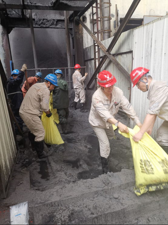 上午10時(shí),暴雨加劇,主機(jī)集控室開始大量漏水,吊頂部分塌落,下方的電子設(shè)備間漏水嚴(yán)重,部分參數(shù)失真;汽機(jī)房外的廠內(nèi)主路積水達(dá)50公分;煤溝進(jìn)水;廠前區(qū)全部停電、大門外波濤洶涌;墻外從山上下來的山洪更是濁浪排空。危急關(guān)頭,首陽山項(xiàng)目部20余名黨員干部職工積極參與防汛行動,用沙袋堵塞缺口,加固堤壩,險(xiǎn)情逐漸消除。17時(shí),首陽山發(fā)電公司運(yùn)煤通道路基塌方,燃煤運(yùn)輸中斷。險(xiǎn)情就是命令!面對只有兩天用量的煤炭庫存,項(xiàng)目部人員積極參與到首陽山發(fā)電公司抗洪搶險(xiǎn)隊(duì)伍中,共筑防汛抗洪“同心堤”。經(jīng)過連續(xù)八個(gè)小時(shí)團(tuán)結(jié)奮戰(zhàn),燃煤供應(yīng)線路逐步恢復(fù),大唐人抵抗住了偃師幾十年罕見的暴雨襲擊,為地方抗洪搶險(xiǎn)、保障城市安全電力貢獻(xiàn)了力量。