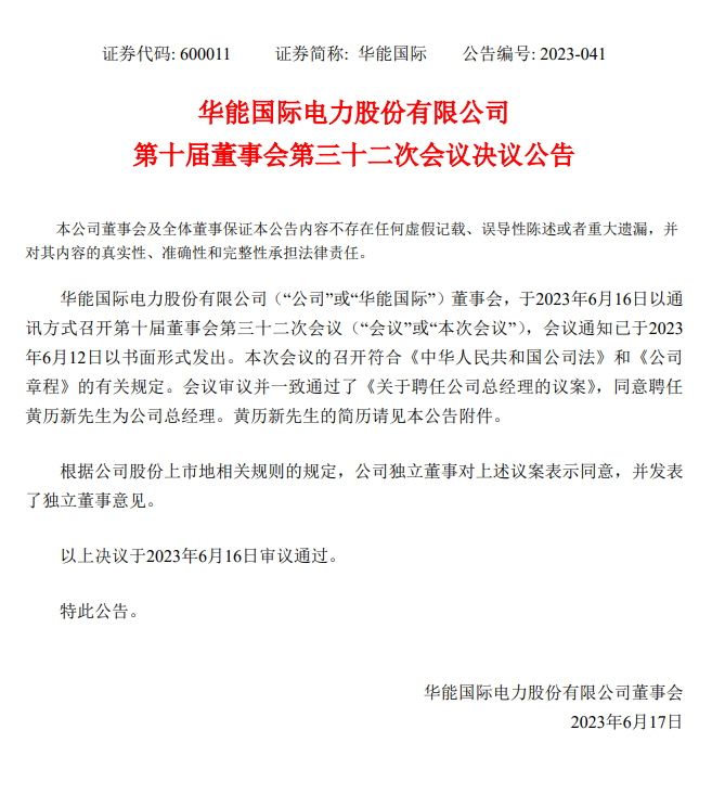 2022年9月26日,華能國際原總經(jīng)理趙平先生因年齡原因辭職。華能國際公告稱,在華能國際聘任新任總經(jīng)理前,由華能國際董事長趙克宇先生代行總經(jīng)理職責(zé)。時隔9個月,華能國際總經(jīng)理一職終于迎來新人選!2023年6月16日,華能國際召開董事會,審議并一致通過了《關(guān)于聘任公司總經(jīng)理的議案》,同意聘任黃歷新先生為公司總經(jīng)理。