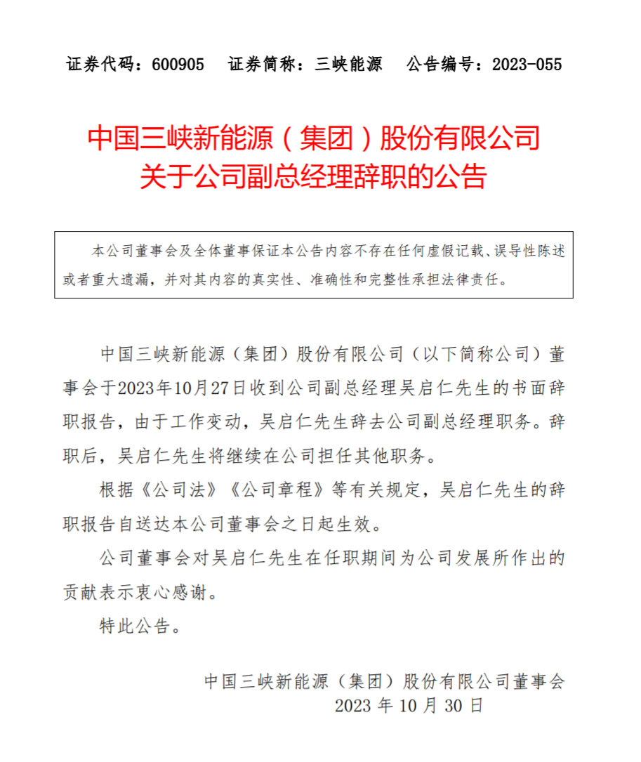 三峽能源10月30日公告稱,公司董事會于2023年10月27日收到副總經理吳啟仁先生的書面辭職報告,由于工作變動,吳啟仁先生辭去公司副總經理職務。辭職后,吳啟仁先生將繼續(xù)在公司擔任其他職務。