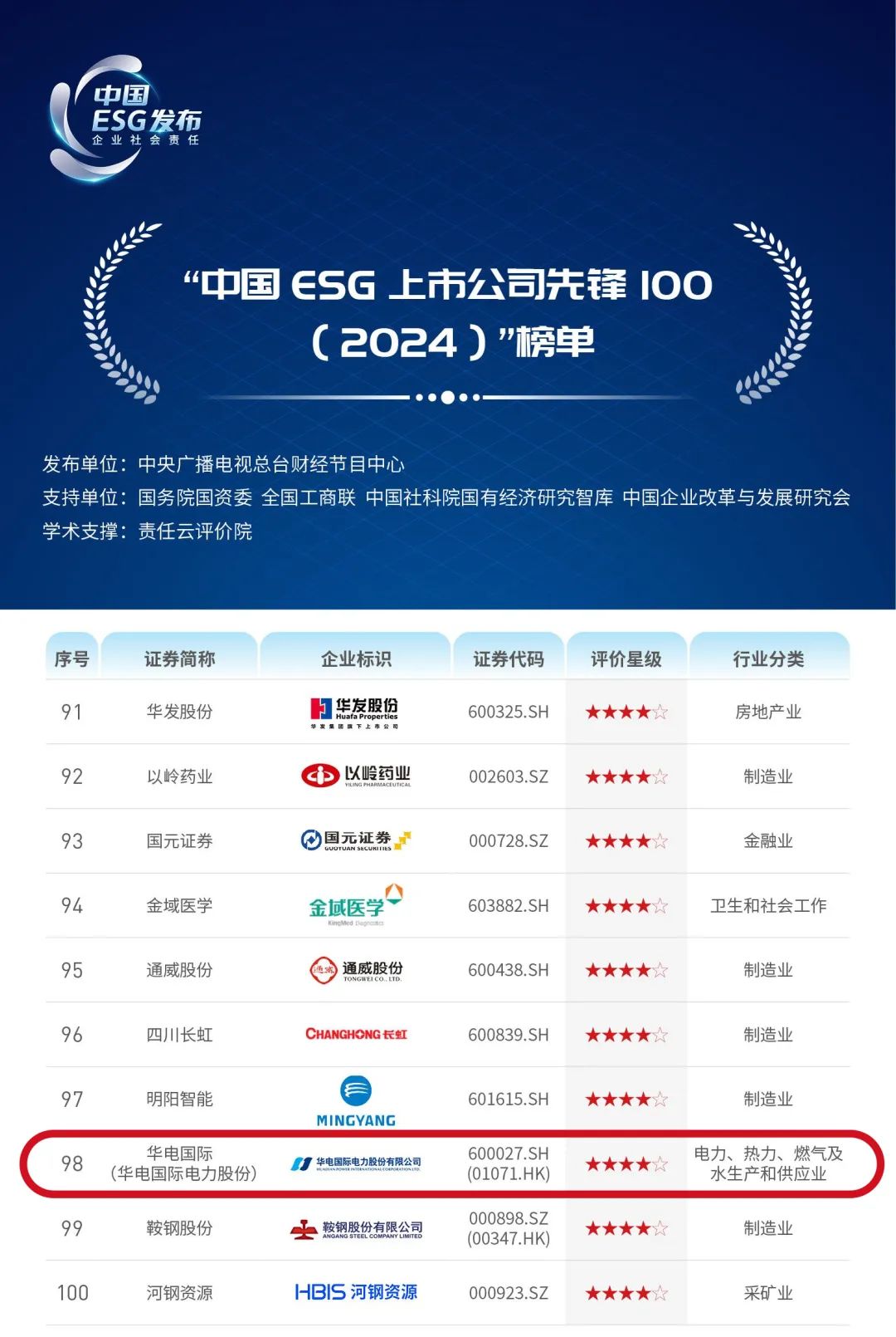 6月30日下午,中央廣播電視總臺(tái)財(cái)經(jīng)節(jié)目中心聯(lián)合國(guó)務(wù)院國(guó)資委、全國(guó)工商聯(lián)、中國(guó)社科院國(guó)有經(jīng)濟(jì)研究智庫(kù)、中國(guó)企業(yè)改革與發(fā)展研究會(huì)在京正式發(fā)布“中國(guó)ESG(企業(yè)社會(huì)責(zé)任)《2024年度ESG行動(dòng)報(bào)告》”。《報(bào)告》公布了“中國(guó)ESG上市公司先鋒100”榜單,中國(guó)華電所屬華電國(guó)際電力股份有限公司成功入圍。