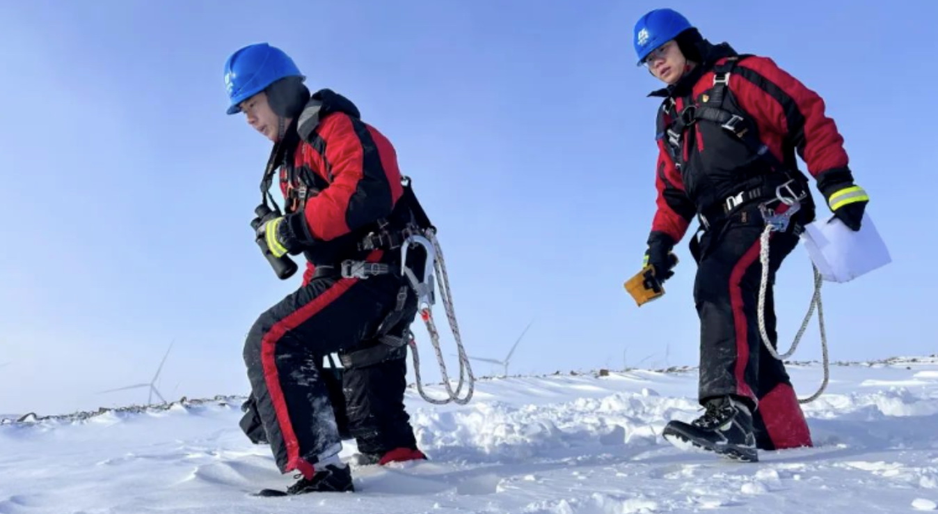 在最高氣溫只有零下26攝氏度河北張家口沽源縣,華電冀北新能源馳盛風(fēng)電場的運(yùn)維員工,冒著寒風(fēng)對(duì)輸配電線路進(jìn)行特巡,及時(shí)啟動(dòng)極寒天氣應(yīng)急預(yù)案,通過“可視化+無人機(jī)+人工巡檢”的方式,開展線路及站內(nèi)設(shè)備特巡,加強(qiáng)設(shè)備監(jiān)控和消缺。