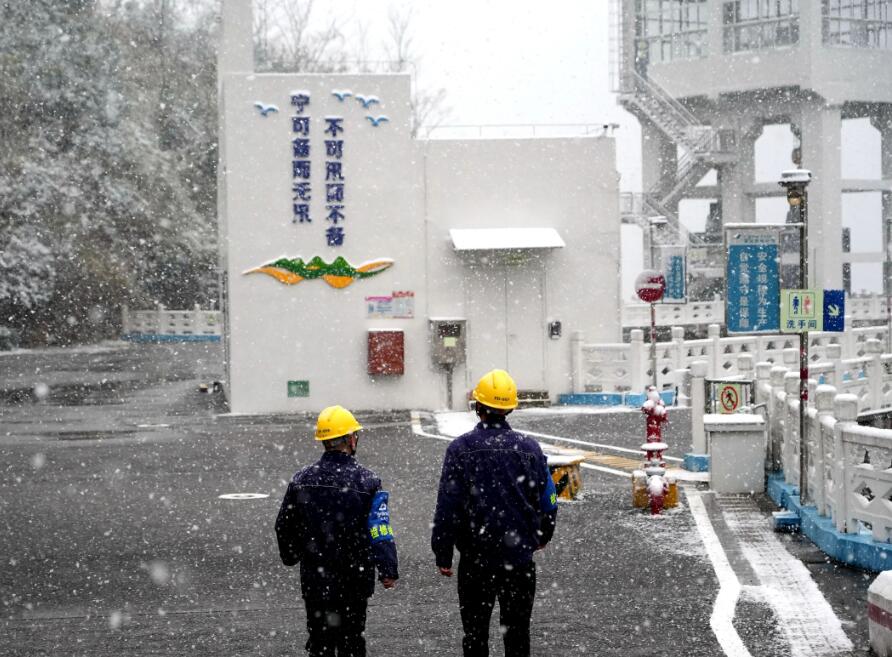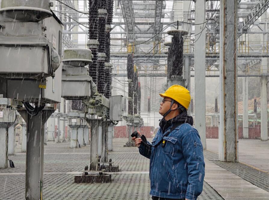 暴雪突至,浙江烏溪江公司運行人員在湖南鎮(zhèn)電站220KV開關站加強室外巡檢。