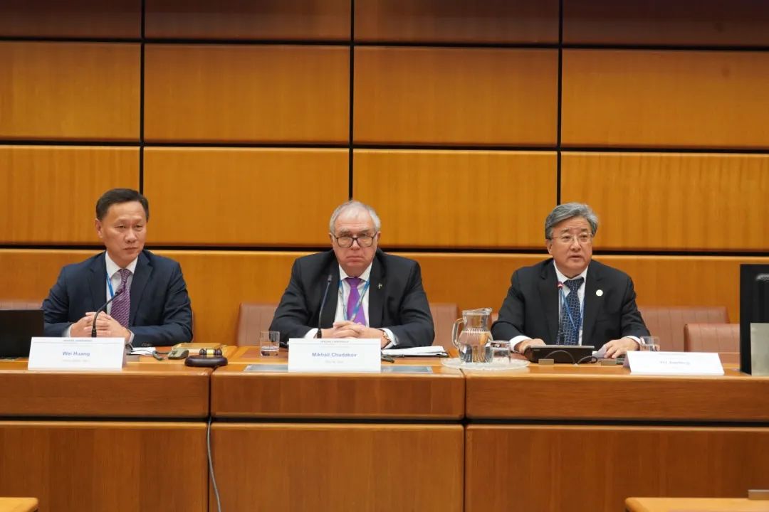 當?shù)貢r間18日上午,余劍鋒與國際原子能機構(gòu)副總干事丘達科夫共同在“驅(qū)動未來、引領(lǐng)零碳之路”主題邊會上致辭。