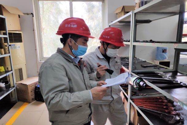 圖為該公司督查小組正在查看外委單位工器具臺賬記錄