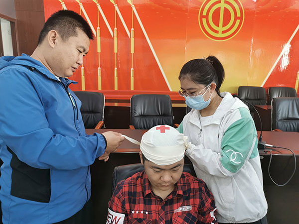 職工進(jìn)行傷員傷口固定練習(xí)