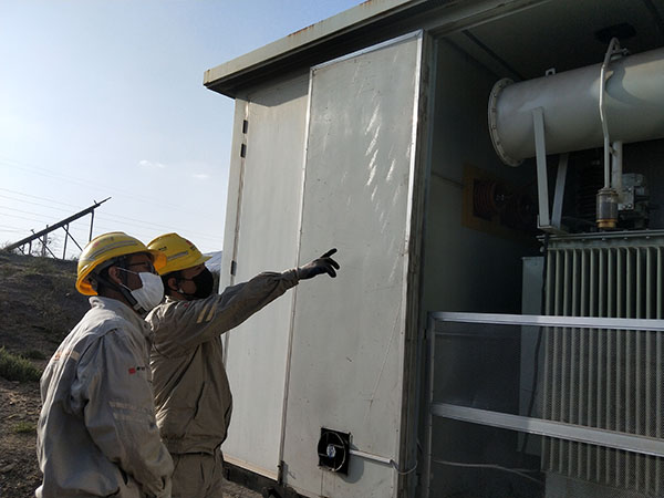 安全員帶領(lǐng)班員進(jìn)行變壓器本體檢查