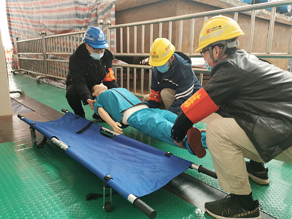 此次演練在主安裝廠2號機組大修現(xiàn)場進行,模擬兩名施工人員在轉(zhuǎn)輪支架3米多高的平臺上焊接縫隙,一名工作人員未系安全帶進行作業(yè),不慎摔倒墜落。該公司相關部門接到報告后,迅速啟動應急機制,立即撥打120緊急電話,并通知應急救援隊趕赴事故現(xiàn)場。救援現(xiàn)場,應急隊員迅速判斷危險情況,并檢查傷員傷勢,大家齊心協(xié)力將傷員轉(zhuǎn)移到安全地帶,拉起警戒線,對傷員進行緊急檢查。救援人員發(fā)現(xiàn)傷者腿部骨折,無法行動,立即進行骨折包扎急救,按部就班、細致謹慎對傷口進行消毒、止血、固定、包扎。最后,傷員被順利送往醫(yī)院。