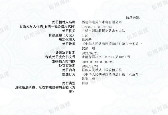 近日,福建華電貢川水電有限公司因相關違法行為,被三明市消防救援支隊永安大隊罰款。