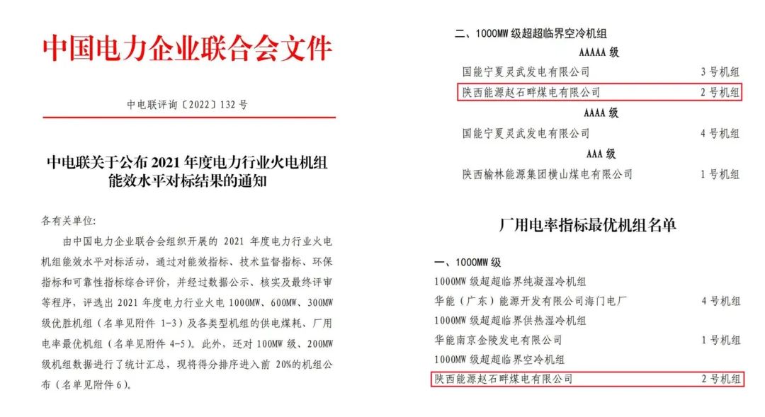 中國(guó)電力網(wǎng)訊  6月29日,從中電聯(lián)傳來(lái)喜訊,趙石畔煤電公司2號(hào)機(jī)組榮獲2021年度電力行業(yè)1000MW級(jí)超超臨界空冷機(jī)組指標(biāo)對(duì)標(biāo)“AAAAA級(jí)優(yōu)勝機(jī)組”及“廠用電率指標(biāo)最優(yōu)機(jī)組”。