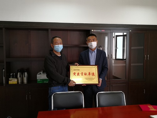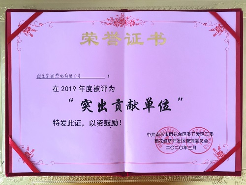 中國電力網訊 4月28日,南京市雨花經濟開發(fā)區(qū)管委會婁杰書記一行四人,蒞臨南京華潤熱電有限公司并向公司授予雨花經濟開發(fā)區(qū)2019年度“突出貢獻單位”獎牌和證書,對公司2019年在開發(fā)區(qū)社會、經濟發(fā)展等工作中做出的突出表現(xiàn)進行表彰??偨浝矶〗翊砉绢I取了獎牌。