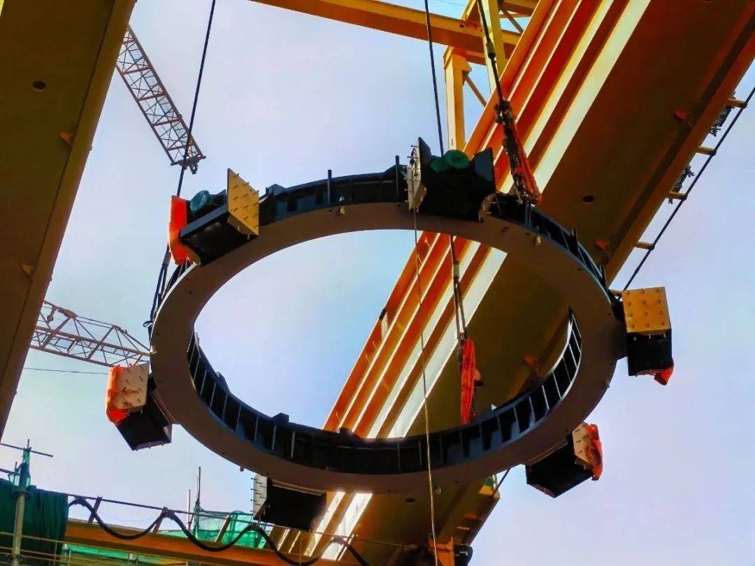 支承環(huán)的安裝位置位于核島正中心的壓力容器堆坑,此時(shí)環(huán)吊橋架位于壓力容器堆坑正上方,支承環(huán)吊裝時(shí)需從環(huán)吊橋架中間穿過,支承環(huán)最大徑向尺寸8004mm,橋架跨度8200mm,因此大大增加了支承環(huán)吊裝難度,對(duì)于吊裝過程中的精準(zhǔn)度提出了更高要求。昌江公司不等不靠,主動(dòng)作為,積極組織各方進(jìn)行聯(lián)合推演,確保吊裝過程中安全與質(zhì)量平穩(wěn)有序。支承環(huán)的順利吊裝,是昌江公司與各參建單位通力合作的又一次良好實(shí)踐。