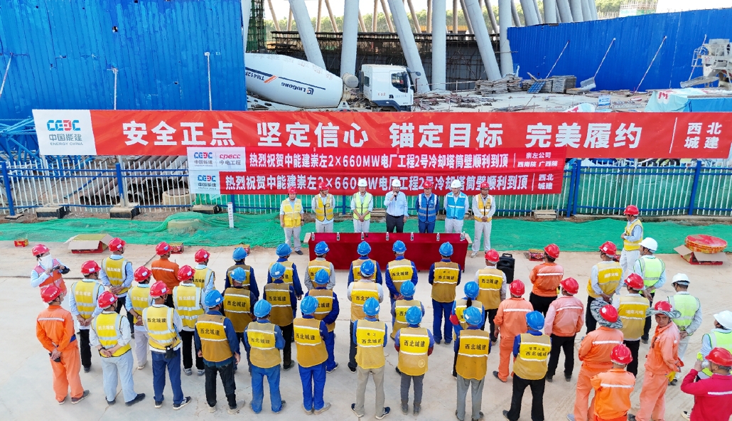 7月25日,中國(guó)能建西北城建承建的中能建崇左2×660兆瓦電廠工程2號(hào)冷卻塔順利到頂。