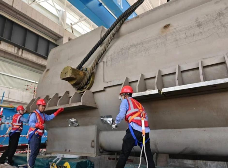 發(fā)電機(jī)定子作為主廠房?jī)?nèi)最重的單體設(shè)備,長10.3米、寬4.868米、高4.7米,重達(dá)367噸。為確保發(fā)電機(jī)定子吊裝平穩(wěn)、就位精準(zhǔn),項(xiàng)目建設(shè)團(tuán)隊(duì)組織制定詳細(xì)的吊裝施工方案,提前做好設(shè)備和工器具保障,從場(chǎng)外運(yùn)輸至場(chǎng)內(nèi)卸車全過程反復(fù)推演,逐項(xiàng)落實(shí)。同時(shí),在吊裝期間實(shí)施全程監(jiān)督,嚴(yán)控安全質(zhì)量,確保整個(gè)吊裝過程安全、有序、可控。