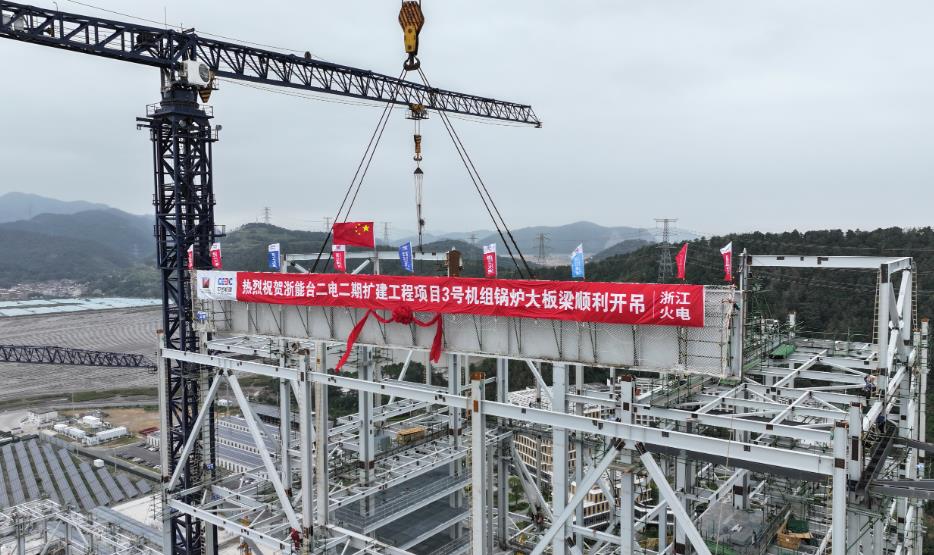 10月25日,中國(guó)能建浙江火電承建的臺(tái)二電二期項(xiàng)目3號(hào)機(jī)組鍋爐首根大板梁吊裝就位。