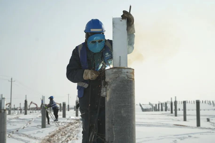 行走在項(xiàng)目現(xiàn)場(chǎng),盡管已經(jīng)立春,但氣溫依舊非常低,寒風(fēng)刺骨。此刻,為保障工程順利推進(jìn),百余名建設(shè)者各就其位忙碌著,一切井然有序。看著項(xiàng)目北區(qū)100萬(wàn)千瓦工程密密麻麻的光伏樁,和散落其中焊樁頭、安裝支架的建設(shè)場(chǎng)景,龍?jiān)磳幭墓鞠嚓P(guān)負(fù)責(zé)人說(shuō):“北區(qū)光伏樁有40萬(wàn)根。如此大規(guī)模的項(xiàng)目,時(shí)序管控最為關(guān)鍵。我們目標(biāo)是要打造‘兩高一低’精品工程,從設(shè)計(jì)就已經(jīng)充分考慮后續(xù)的所有管理重點(diǎn),施工工藝、工程質(zhì)量、設(shè)備管控等等,現(xiàn)場(chǎng)施工各標(biāo)段各自為戰(zhàn),時(shí)序緊湊,施工進(jìn)度安全高效快速。”