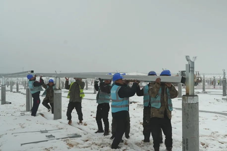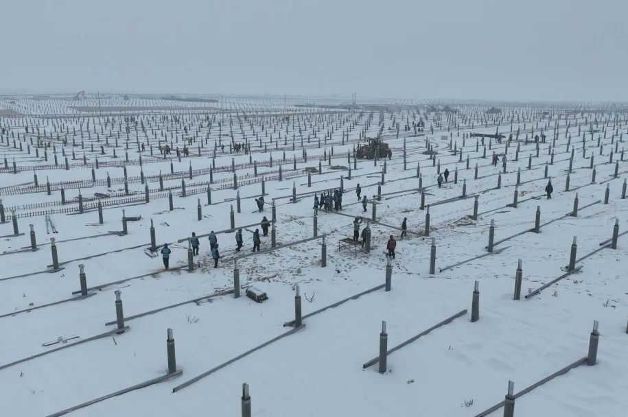 正月初三,在寧夏中衛(wèi)騰格里沙漠腹地,銀裝素裹,前不久一場(chǎng)罕見(jiàn)的大雪將浩瀚沙漠裹得嚴(yán)嚴(yán)實(shí)實(shí),給項(xiàng)目施工帶來(lái)了嚴(yán)峻考驗(yàn)。