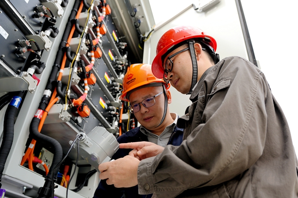 設備調(diào)試中,往往需要不止一次地反復驗證。5號電池艙通訊與EMS后臺通訊存在頻繁中斷的現(xiàn)象,廠家經(jīng)采取更換通訊電纜及裝置、加裝抗干擾磁環(huán)等措施,問題仍未消除。伍玉祥帶著團隊一起重新梳理通訊柜的接地線,仔細分析原因并改變接地方式,終于解決5號電池艙通訊中斷的難題。