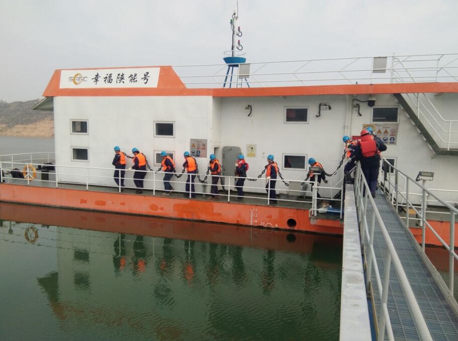 陜西能源趙石畔煤電生產(chǎn)用水,取自無定河流域王圪堵水庫地表水。取水主要設(shè)備集中布置在取水泵船,通過一根DN450鋼管,經(jīng)中繼泵站—高位水池送至廠內(nèi)原水池,總長約16公里。其中泵船出口220米管線,屬于地上部分,由11個浮箱支撐連接到岸邊,漂浮在水面的浮箱靠兩個牽引錨固定。泵船抵抗水流、大風的作用,主要依靠首尾拋放的5個700公斤的霍爾錨通過錨鏈進行調(diào)整固定。近期水庫水位上漲,泵船艏部13號錨鏈富余量不足,加長錨鏈工作迫在眉睫。公司新采購錨鏈長27.5米,重500公斤,岸邊到泵船有240米距離,無法通過機械運送到位。材料重、廊道窄、臨水作業(yè),存在很大安全風險,如何將錨鏈安全搬運至泵船并連接安裝成為一道難題。為確保安全,趙石畔煤電相關(guān)技術(shù)人員進行現(xiàn)場勘查,結(jié)合實際情況,最終確定采用人力搬運通過0.8米寬、240米長的廊道運到泵船上,再進行安裝加長的工作方案。