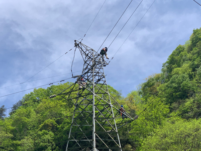 此次維保檢修的二郎壩發(fā)電35kV臥天架空輸配電線路全長約18公里,共有桿塔43級,其中鐵塔22級,混凝土水泥桿塔21級,均為山區(qū)架空線路,且位于陜南山區(qū),叢林密布、道路濕滑,檢修維保工作難度大。施工前,電力運(yùn)營提前抽調(diào)專業(yè)技術(shù)人員對現(xiàn)場情況進(jìn)行實(shí)地勘察,就天氣情況、檢修方案、危險點(diǎn)進(jìn)行分析討論,梳理設(shè)備缺陷隱患,并制定了完善的檢修方案及“三措兩案”。檢修人員披荊斬棘、逐桿逐級檢修,共計(jì)消除桿塔金具缺陷339條、更換破損絕緣子5片、更換避雷器1組,有效地提高了輸電線路設(shè)備的健康和運(yùn)行水平,以優(yōu)質(zhì)、高效的檢修成果確保了業(yè)主方輸電線路安全可靠運(yùn)行。
