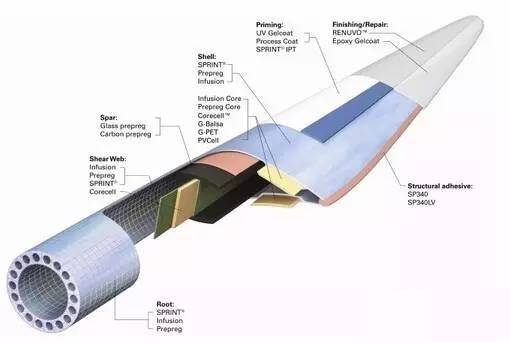 預(yù)浸料是生產(chǎn)復(fù)雜形狀結(jié)構(gòu)件的理想工藝,預(yù)浸料在國外運(yùn)用非常廣泛,其工藝及設(shè)備也發(fā)展到成熟階段。實(shí)際生產(chǎn)中,由于葉片的蒙皮、主梁、根部等各個(gè)部位的力學(xué)性能及工藝的要求各不相同,因而,在不影響性能的條件下,為了降低成本,不同部分使用不同的預(yù)浸料。
