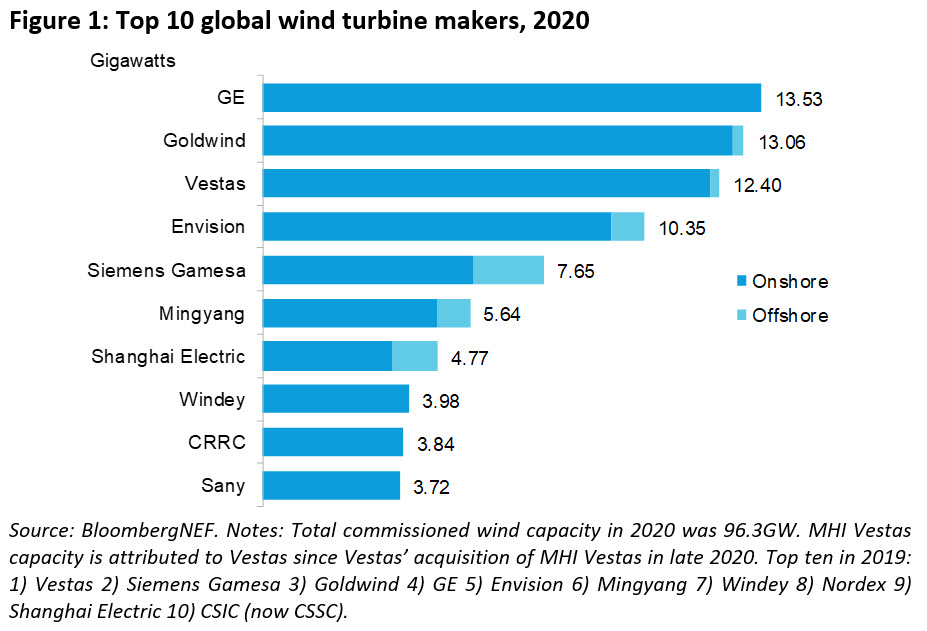 2020年,隨著美國和中國市場的快速增長,通用電氣成為全球最大的風機制造商,占13.53吉瓦,其次是金風科技(13.06吉瓦),維斯塔斯(12.4吉瓦),遠景能源(10.35吉瓦),西門子歌美颯(7.65吉瓦)。