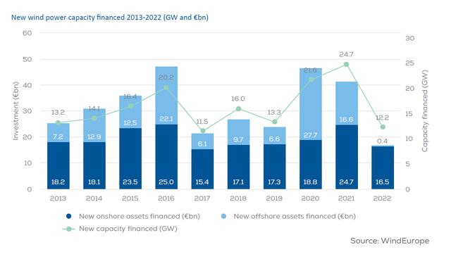 報(bào)告顯示,170億歐元投資中有約165億歐元用于建設(shè)陸上風(fēng)電,法國(guó)是唯一一個(gè)為兩個(gè)總?cè)萘繛?0兆瓦的小型海上風(fēng)力項(xiàng)目提供資金的國(guó)家。沒有一個(gè)商業(yè)規(guī)模的海上風(fēng)電場(chǎng)在2022年達(dá)成最終投資決定(FID)。對(duì)于投資變緩原因,該協(xié)會(huì)表示,歐洲風(fēng)能行業(yè)仍在遭受更高的投入成本和供應(yīng)鏈中斷的危機(jī)。俄烏沖突、高通脹和電價(jià)飆升加劇了原材料和國(guó)際航運(yùn)成本的上升,在過去兩年里,歐洲風(fēng)機(jī)生產(chǎn)成本上漲了40%。