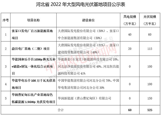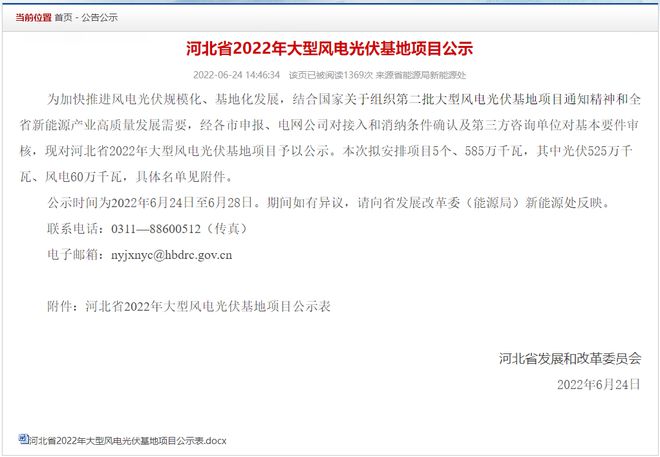 6月24日,河北省2022年大型風(fēng)電光伏基地項目公示,涉及項目5個、585萬千瓦,其中光伏525萬千瓦、風(fēng)電60萬千瓦。