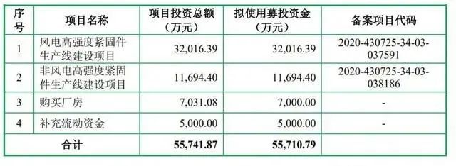 本次IPO,飛沃科技公開(kāi)發(fā)行A股股票1347萬(wàn)股,發(fā)行價(jià)格72.5元/股,募集資金總額約為9.77億元,擬用于風(fēng)電高強(qiáng)度緊固件生產(chǎn)線建設(shè)項(xiàng)目、非風(fēng)電高強(qiáng)度緊固件生產(chǎn)線建設(shè)項(xiàng)目、購(gòu)買廠房、補(bǔ)充流動(dòng)資金等。