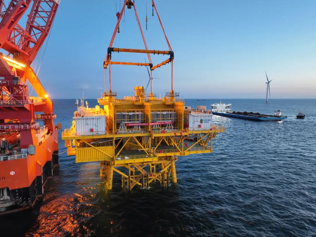 8月23日18時58分,國家電投山東能源投資建設(shè)的山東半島南U1場址海上風(fēng)電項目海上升壓站上部組塊與導(dǎo)管架精準(zhǔn)對接,標(biāo)志著國內(nèi)單體容量最大、集電線路電壓等級最高的模塊化預(yù)裝式海上升壓站吊裝順利完成。