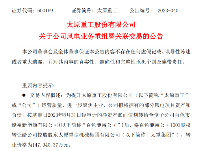 公告披露,太原重工擬將擁有的部分風(fēng)電項目資產(chǎn)和負(fù)債,按基準(zhǔn)日2023年8月31日經(jīng)審計的凈資產(chǎn)賬面值劃轉(zhuǎn)給全資子公司百色市能裕新能源有限公司(以下簡稱“百色能裕公司”)后,將百色能裕公司100%股權(quán)轉(zhuǎn)讓給公司控股股東太原重型機(jī)械集團(tuán)有限公司(以下簡稱“太重集團(tuán)”),轉(zhuǎn)讓價格為147,940.37萬元。