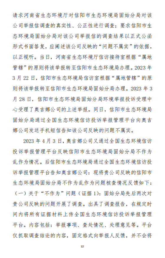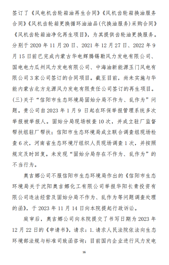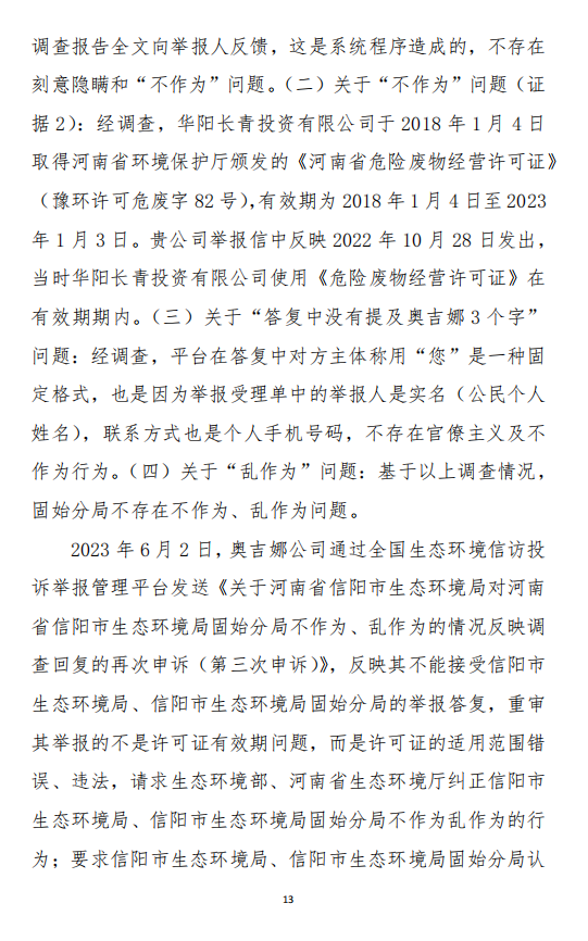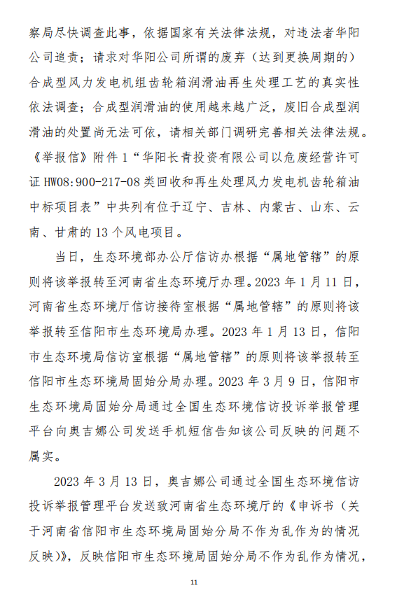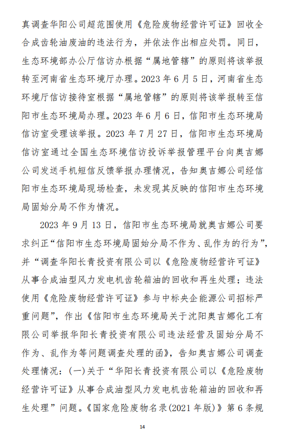 2023年3月9日,奧吉娜公司收到固始分局通過12369環(huán)境信訪平臺的短信答復(fù):“反映問題不屬實”。3月10日,奧吉娜公司向固始分局負(fù)責(zé)人電話詢問,其解釋稱:經(jīng)調(diào)查核實,華陽長青公司沒有再生風(fēng)電潤滑油銷售,出售的是新油。否定了奧吉娜公司的舉報內(nèi)容。對此,奧吉娜公司表示強(qiáng)烈不滿。3月11日,奧吉娜公司向環(huán)境部投訴固始分局的不作為和亂作為。2023年5月26日,奧吉娜公司收到12369環(huán)境信訪平臺的短信答復(fù)。答復(fù)部門為信陽環(huán)境局。令人啼笑皆非的是,答復(fù)稱,華陽長青的許可證有效期沒有問題,與舉報內(nèi)容風(fēng)馬牛不相及。2023年6月13日,奧吉娜公司再次向環(huán)境部提出申訴,指出,奧吉娜舉報的不是許可證有效期問題,而是許可證的適用范圍錯誤、違法。2023年7月27日,奧吉娜公司收到回復(fù)稱,經(jīng)信陽市生態(tài)環(huán)境局現(xiàn)場檢查,未發(fā)現(xiàn)固始分局不作為情況。2023年8月3日,奧吉娜公司向河南省生態(tài)環(huán)境廳(以下稱:環(huán)境廳)舉報信陽環(huán)境局包庇固始分局的行為。環(huán)境廳對此高度重視,有關(guān)處長和奧吉娜公司負(fù)責(zé)人進(jìn)行了面談。2023年9月13日,信陽環(huán)境局向奧吉娜公司致《信陽市生態(tài)環(huán)境局關(guān)于沈陽奧吉娜化工有限公司舉報華陽長青投資有限公司違法經(jīng)營及固始分局不作為、亂作為等問題調(diào)查處理的函》。函中:一是,以“齒輪箱”替換“齒輪箱油”,偷換概念;二是,做出了廢風(fēng)電合成(齒輪)油不屬于危險廢物的結(jié)論;三是,未發(fā)現(xiàn)固始分局存在不作為、亂作為的不當(dāng)行為。再次否定奧吉娜公司的舉報和投訴。