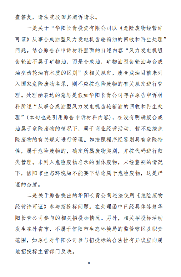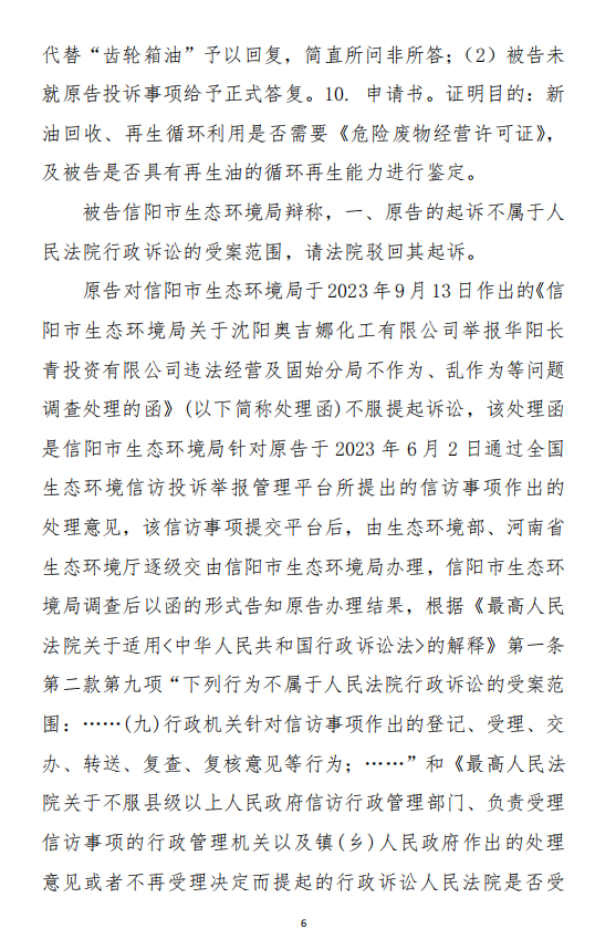 2、訴訟請求:請求人民法院判決撤銷被告作出的《信陽市生態(tài)環(huán)境局關(guān)于沈陽奧吉娜化工有限公司舉報華陽長青投資有限公司違法經(jīng)營及固始分局不作為、亂作為等問題調(diào)查處理的函》;責(zé)令被告對原告向被告舉報華陽長青投資有限公司事項,限期進(jìn)行重新調(diào)查和答復(fù);判令被告認(rèn)定的廢合成油不應(yīng)按危險廢物有關(guān)規(guī)定進(jìn)行管理違反法律規(guī)章規(guī)定,無效。